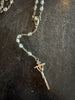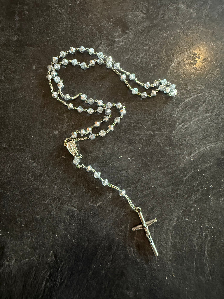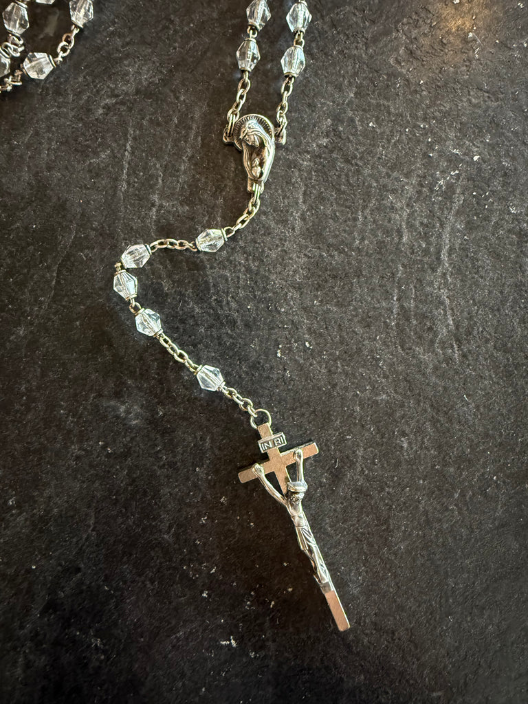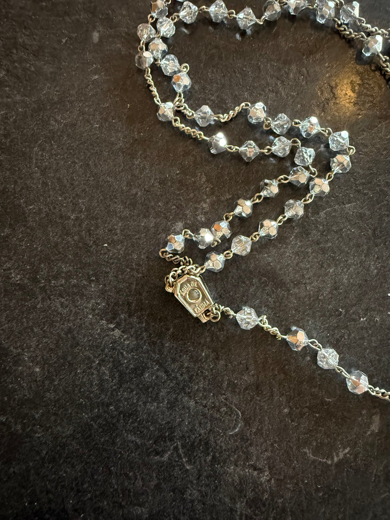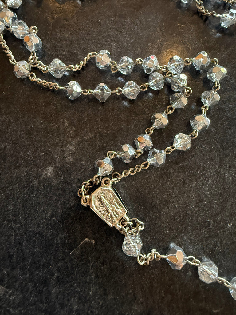Vintage Catholic rosary with Aguade Fatima. Iridescent crystal beads, beautifully made . Measures 19”