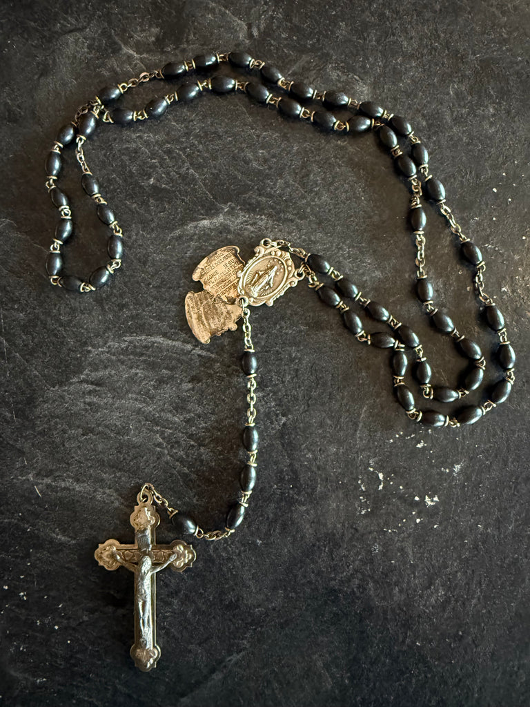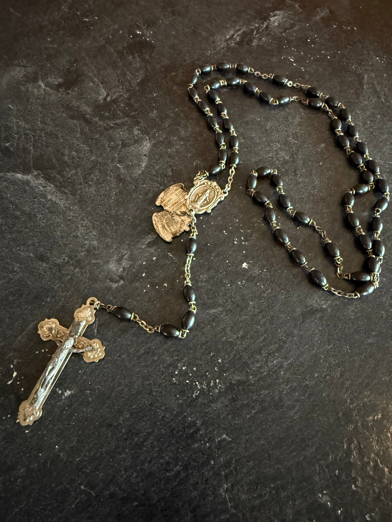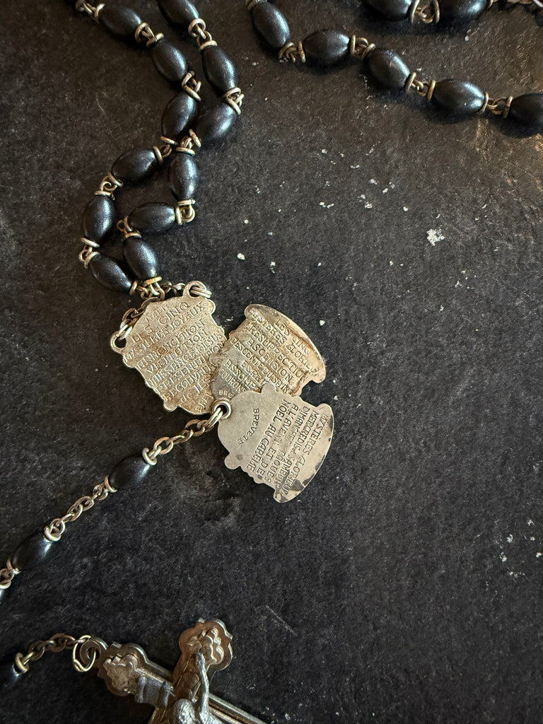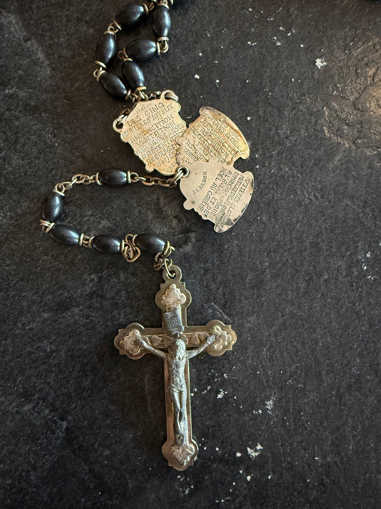 Vintage beaded rosary featuring 5 mysteries of the rosary. Wording is in French. Measures21”. Made in Italy .
