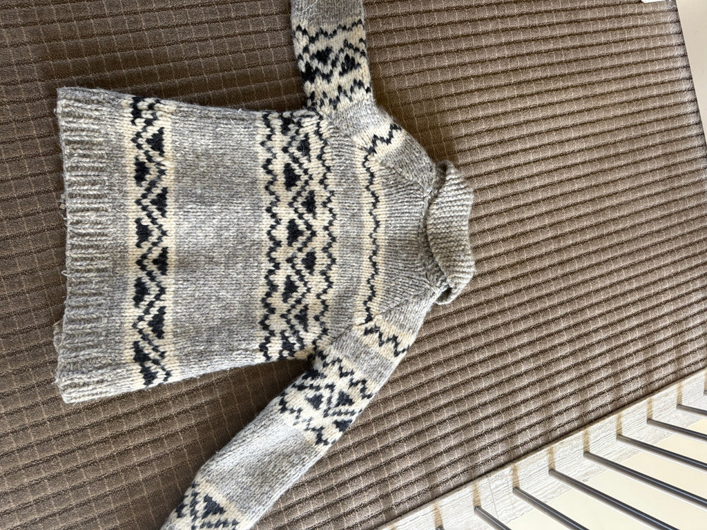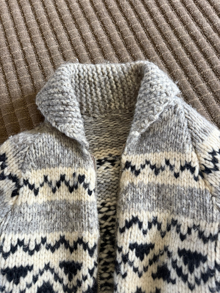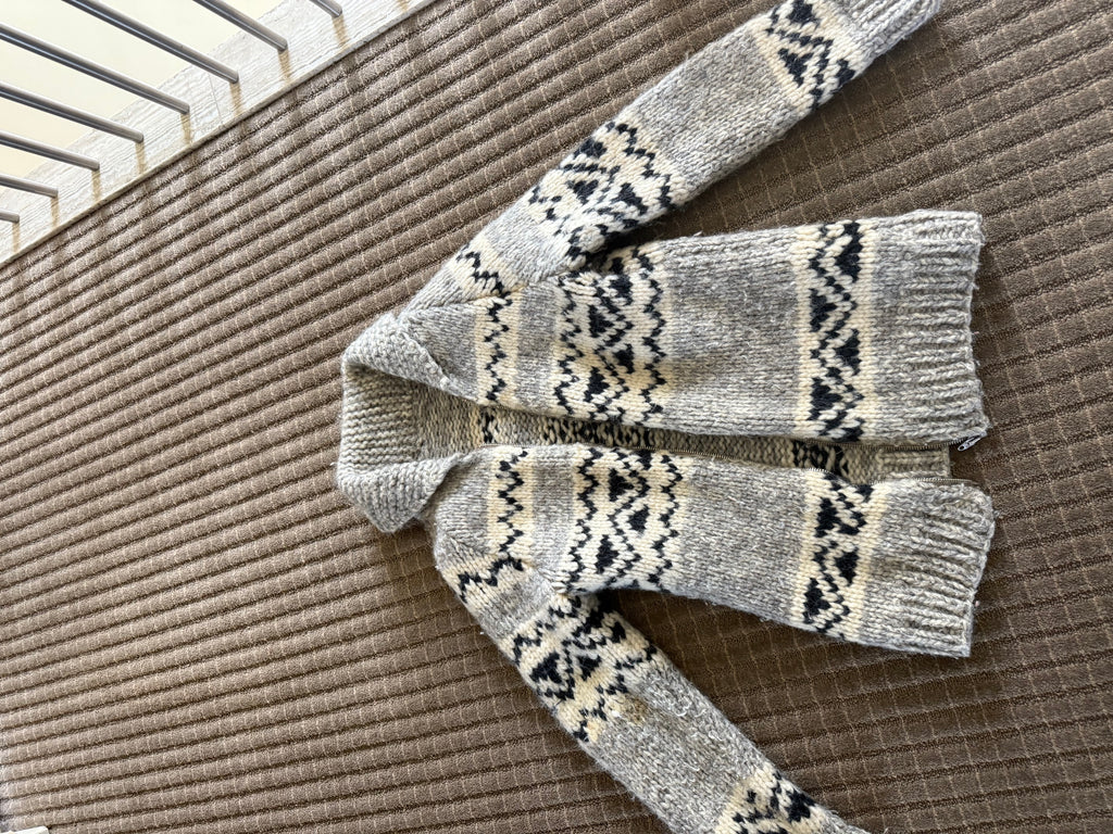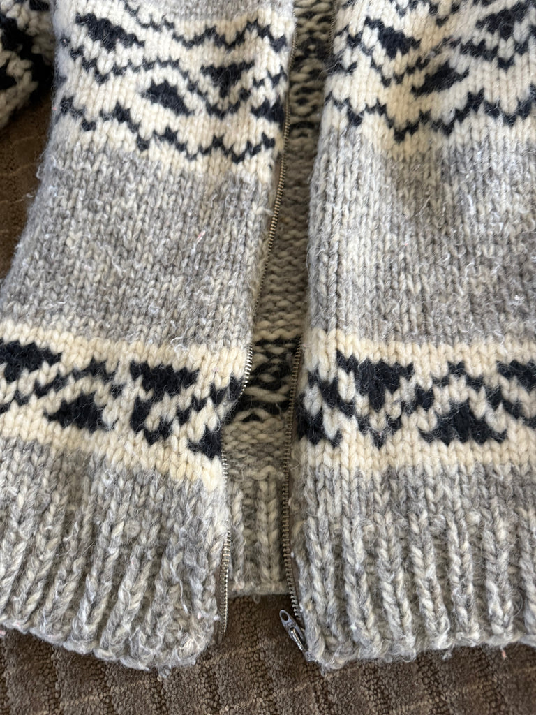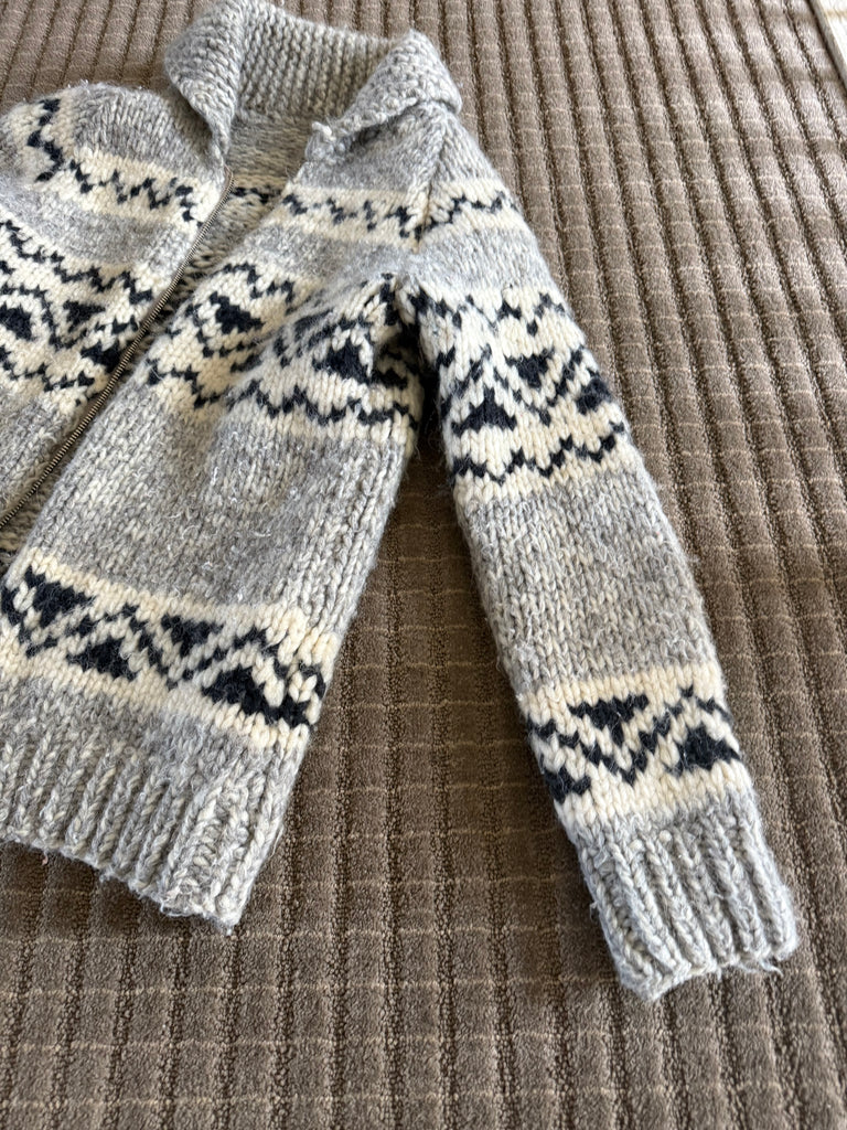 Vintage handmade Canadian Cowichan wool sweater. This beautifully made sweater is built to last. Warm, cozy and perfect for layering. Zipper, rolled collar, traditional pattern. Fits extra small.