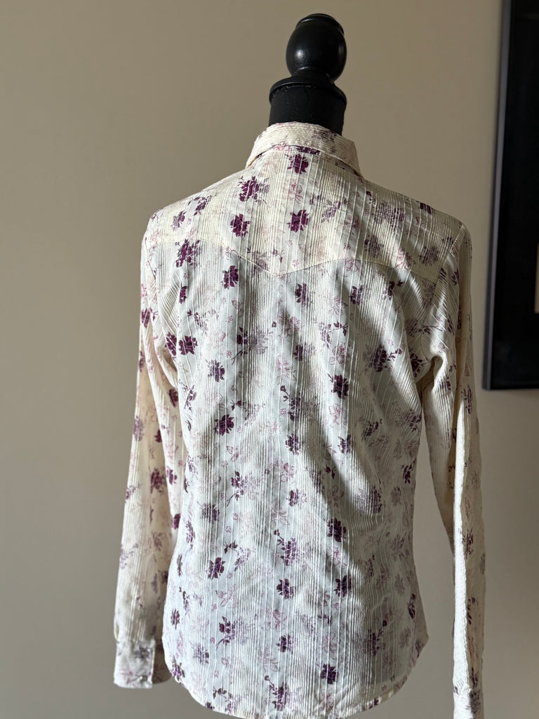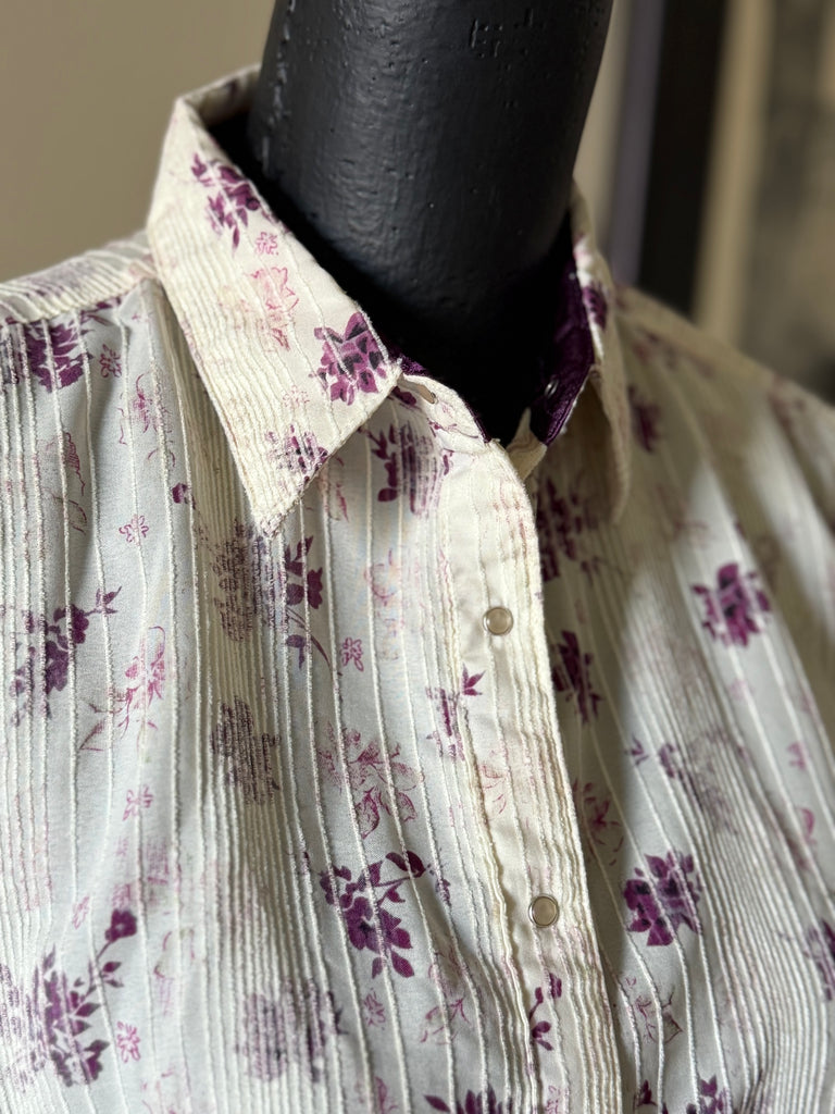 Add a touch of country charm to your wardrobe with our Vintage Wrangler Shirt for Women. Crafted with a western cowgirl style, this size small shirt is the perfect mix of functionality and fashion. Made for the modern cowgirl, it's the perfect addition to any outfit. Gorgeous pearl snap western shirt cream with purple flowers. Size Small. Very flattering on.