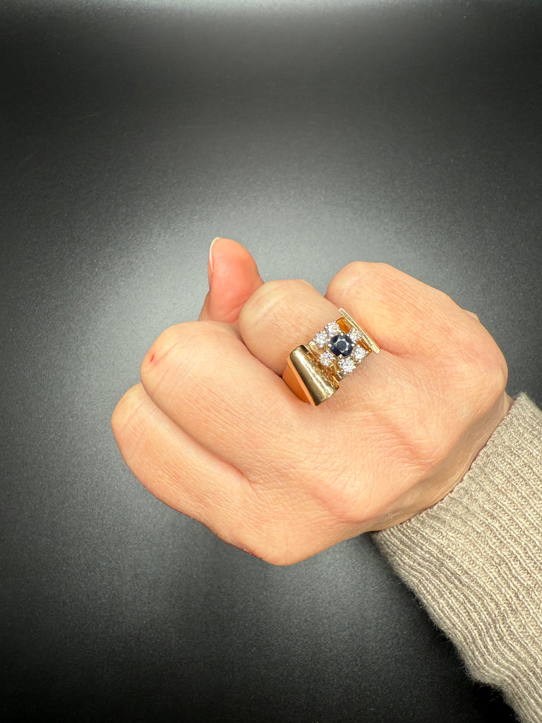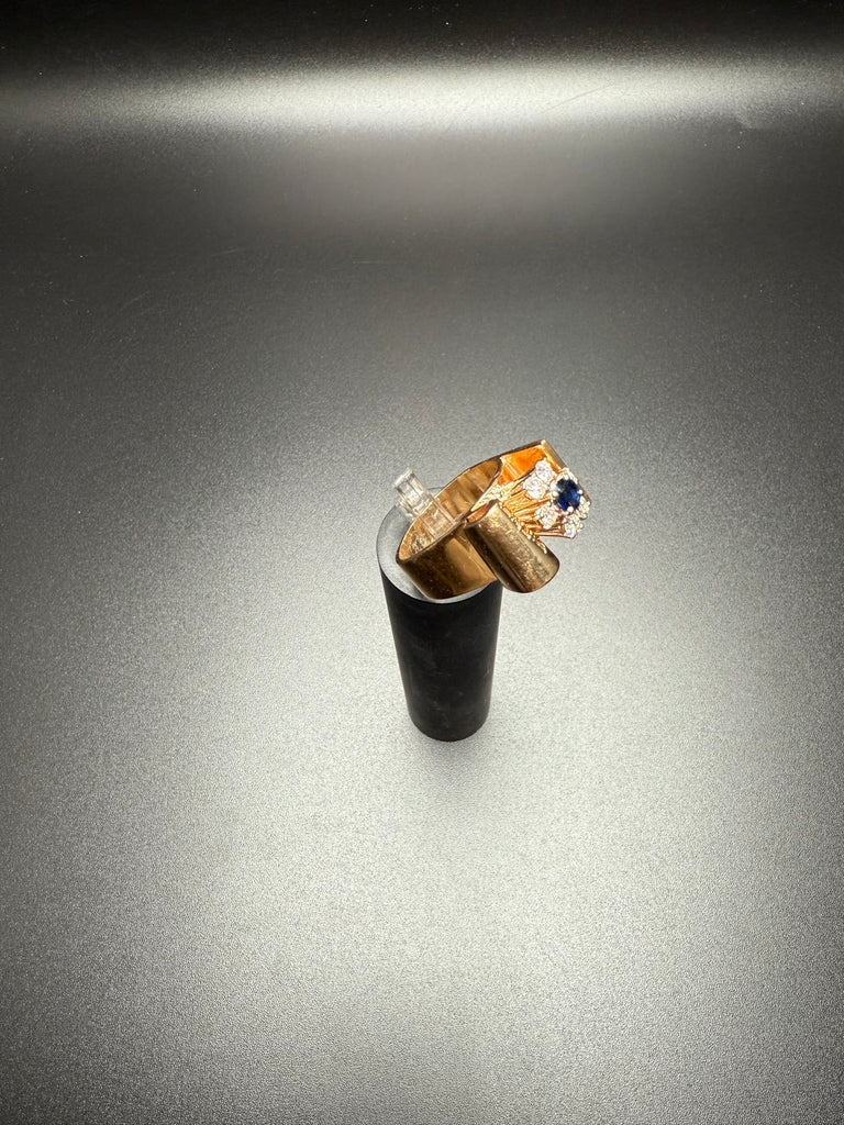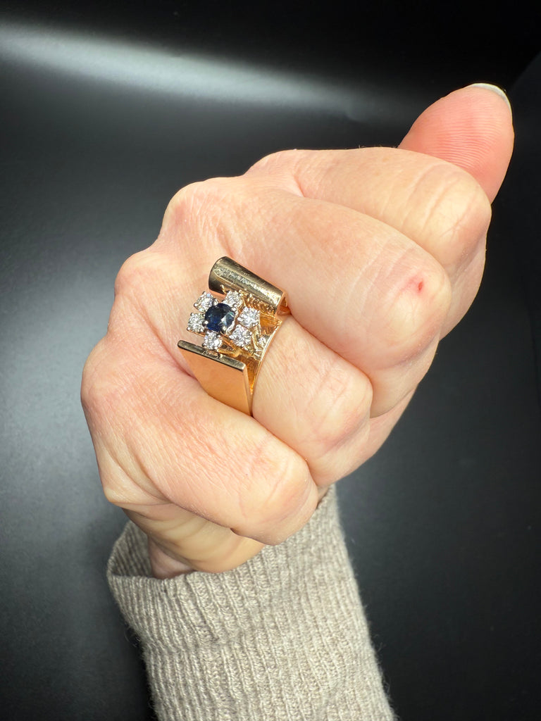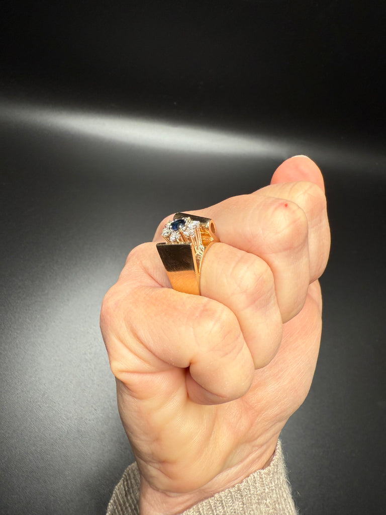 Add a bold touch of luxury to your jewelry collection with this stunning solid 14K gold vintage ring, featuring a deep blue sapphire center stone framed by sparkling diamonds. The sculptural gold wrap design creates a unique, elevated silhouette—perfect for special occasions or everyday elegance.