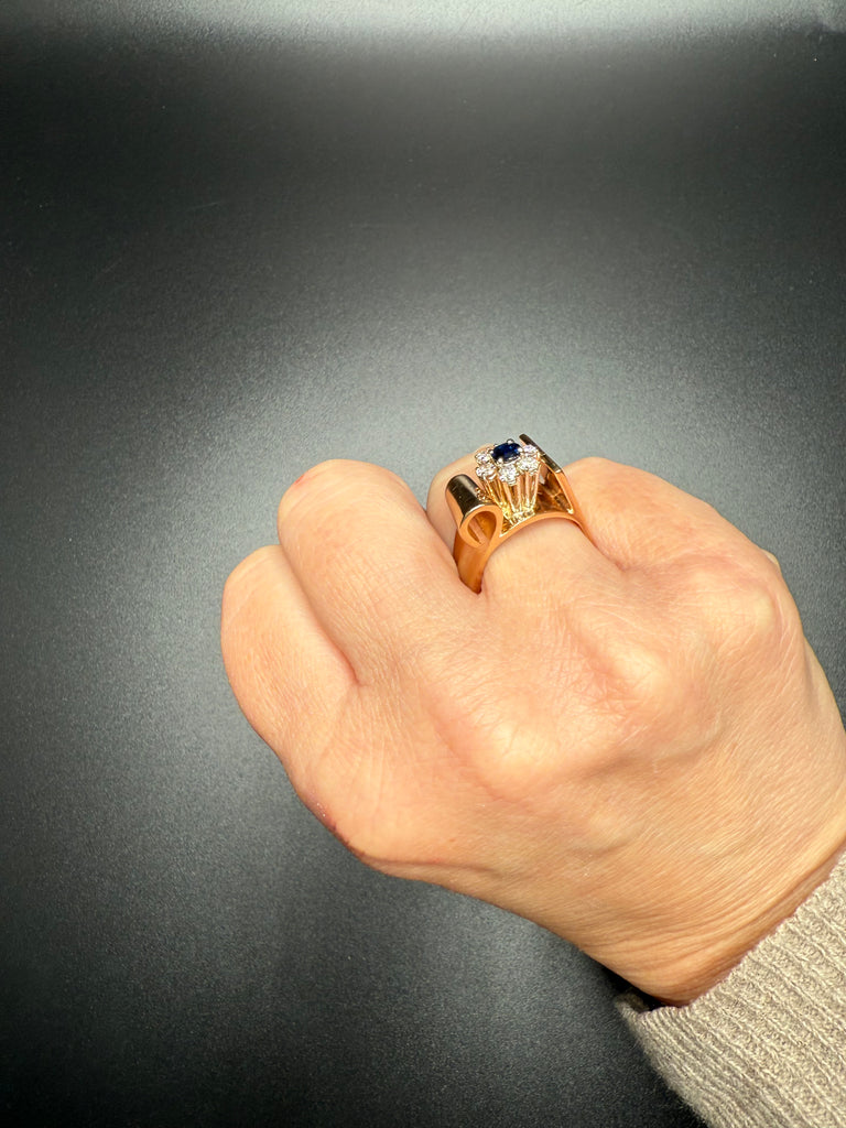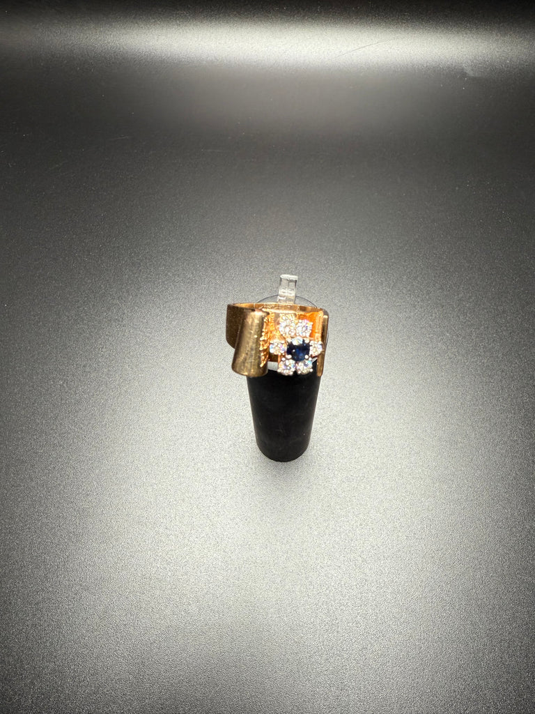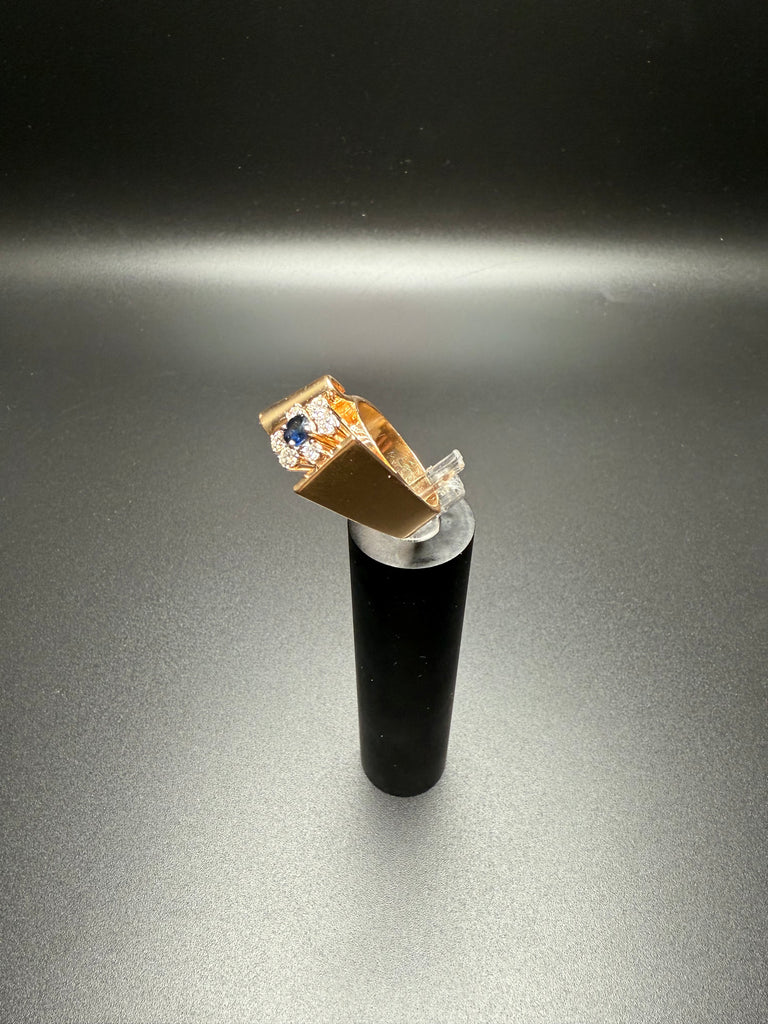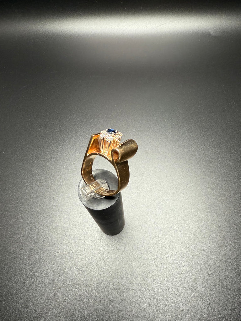 Add a bold touch of luxury to your jewelry collection with this stunning solid 14K gold vintage ring, featuring a deep blue sapphire center stone framed by sparkling diamonds. The sculptural gold wrap design creates a unique, elevated silhouette—perfect for special occasions or everyday elegance.