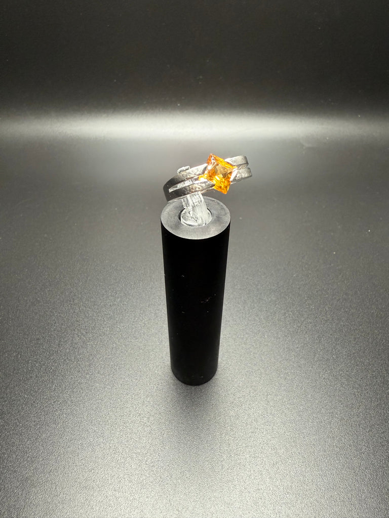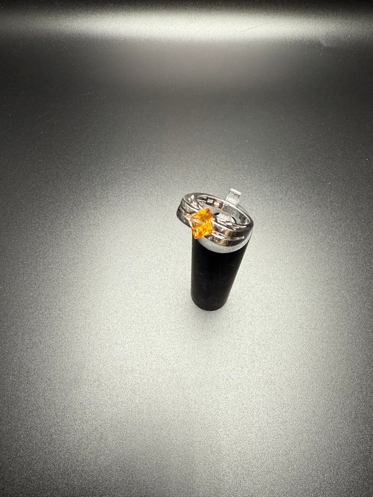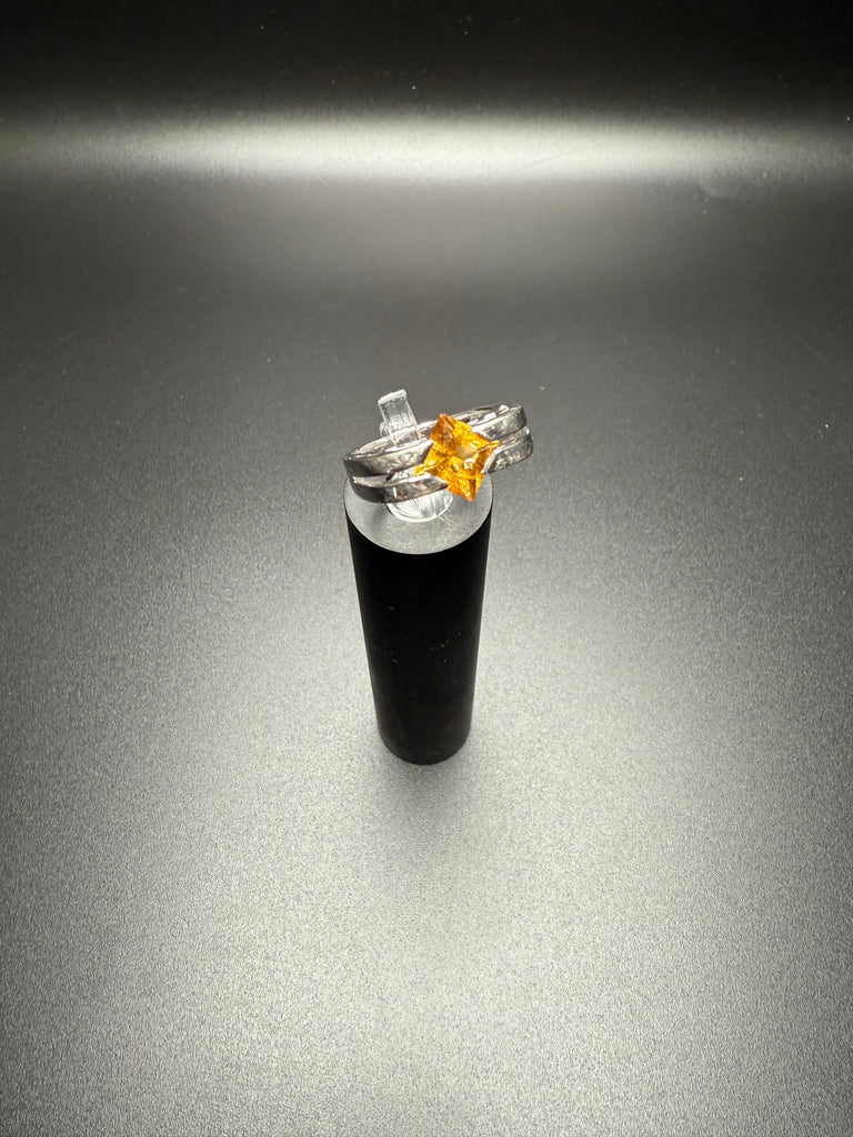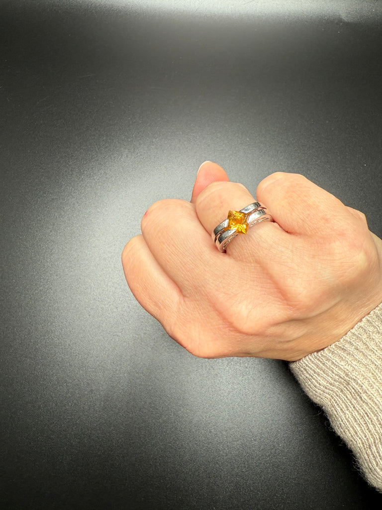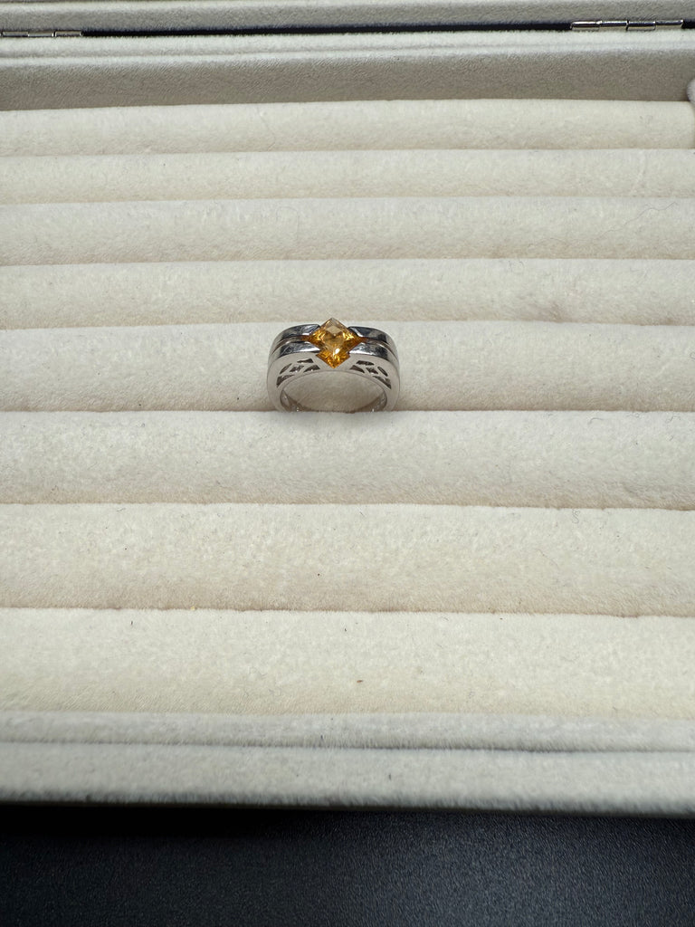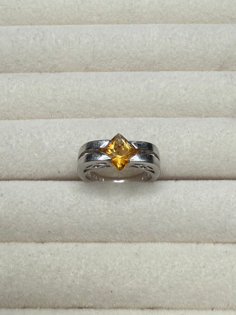 A beautiful and timeless 14k white gold citrine ring featuring a vibrant square-cut citrine set in a sleek, sculptural band. The rich golden hue of the citrine catches the light beautifully and offers a warm contrast against the polished white gold setting.
