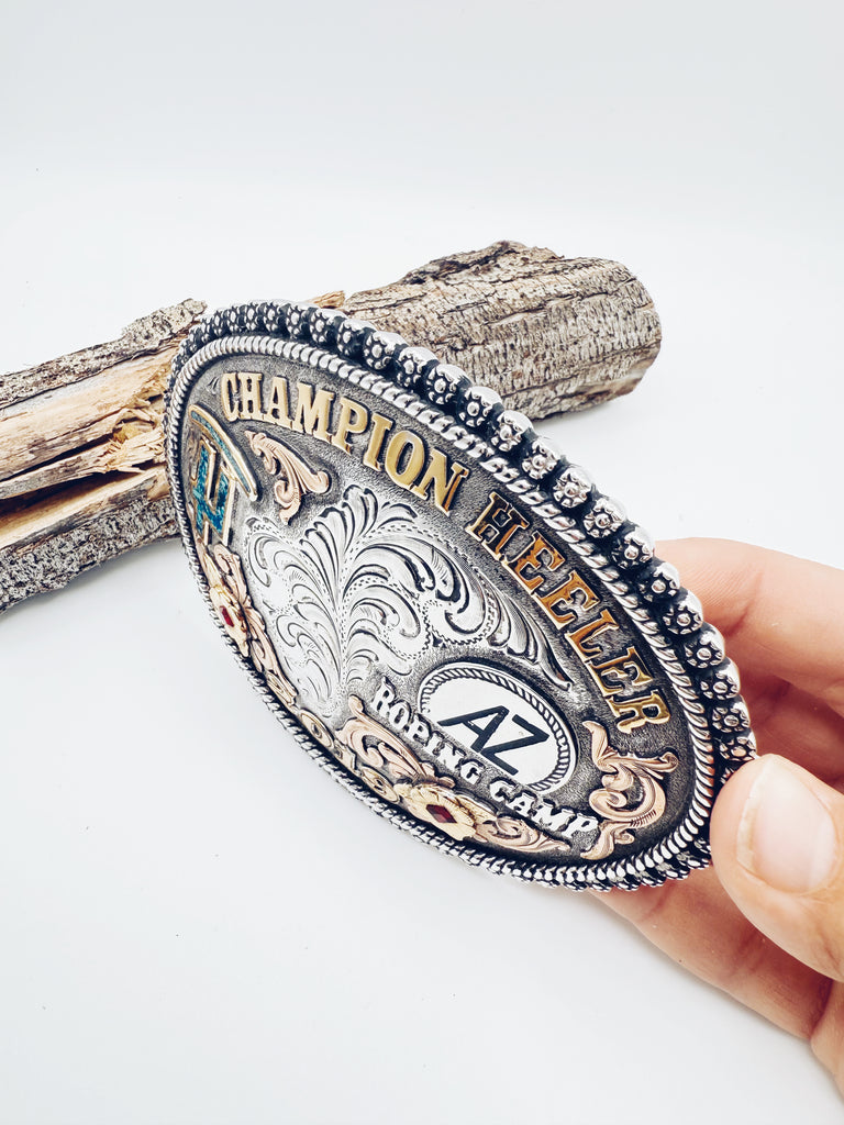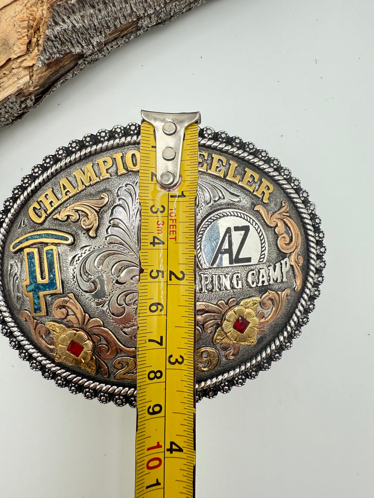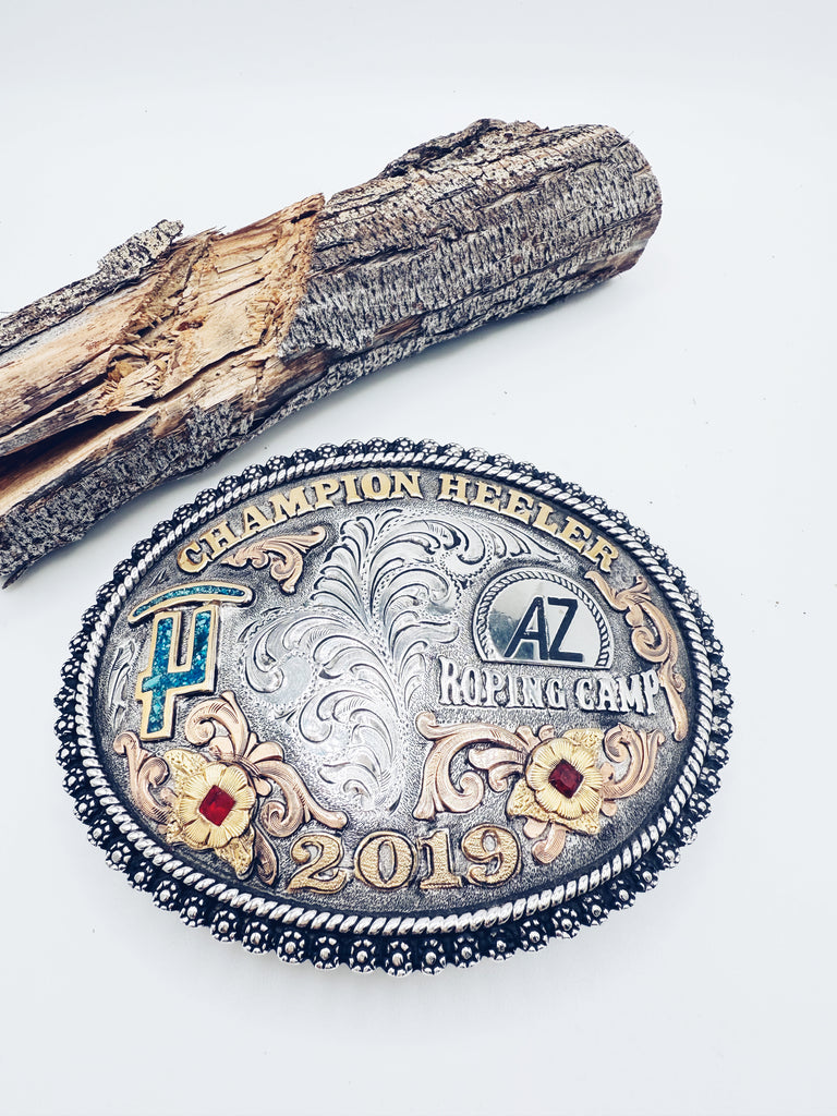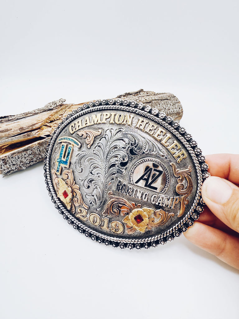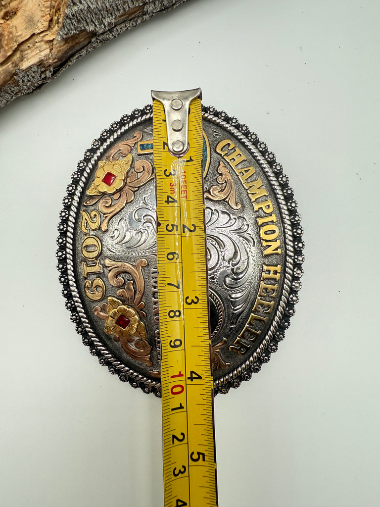 Incredible Legends Silverworks Trophy belt buckle. The details on this buckle are incredible! Champion Heeler, 2019, Roping Camp. Turquoise and Red Stone, exceptional craftsmanship, built to last.