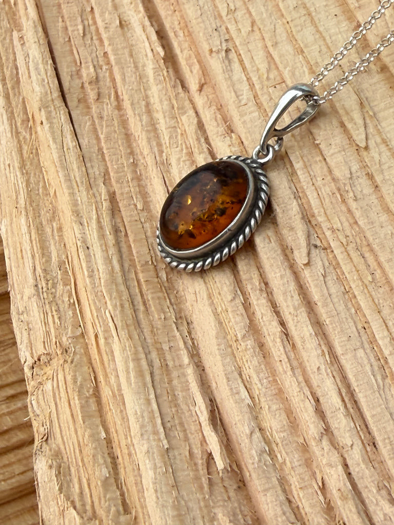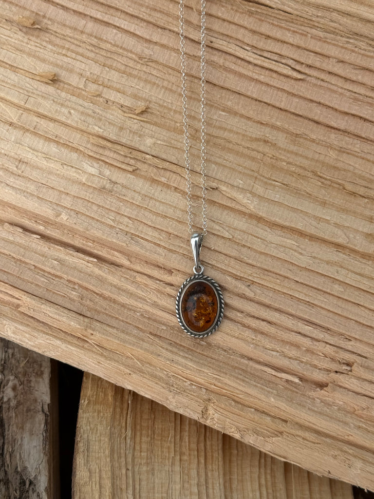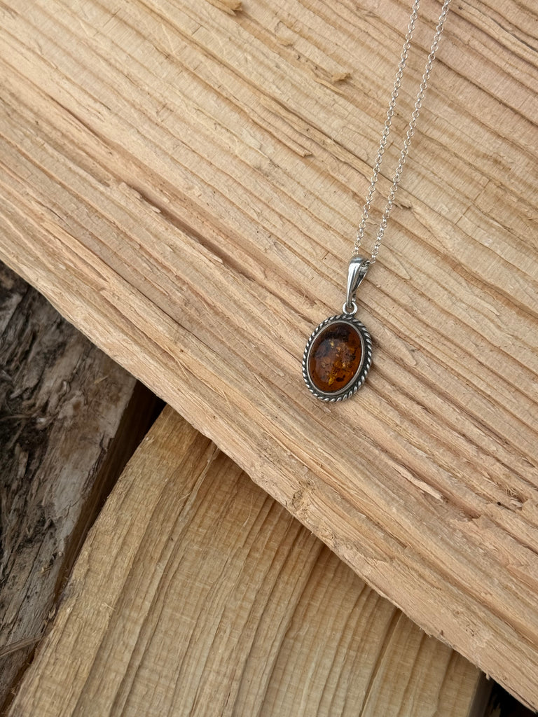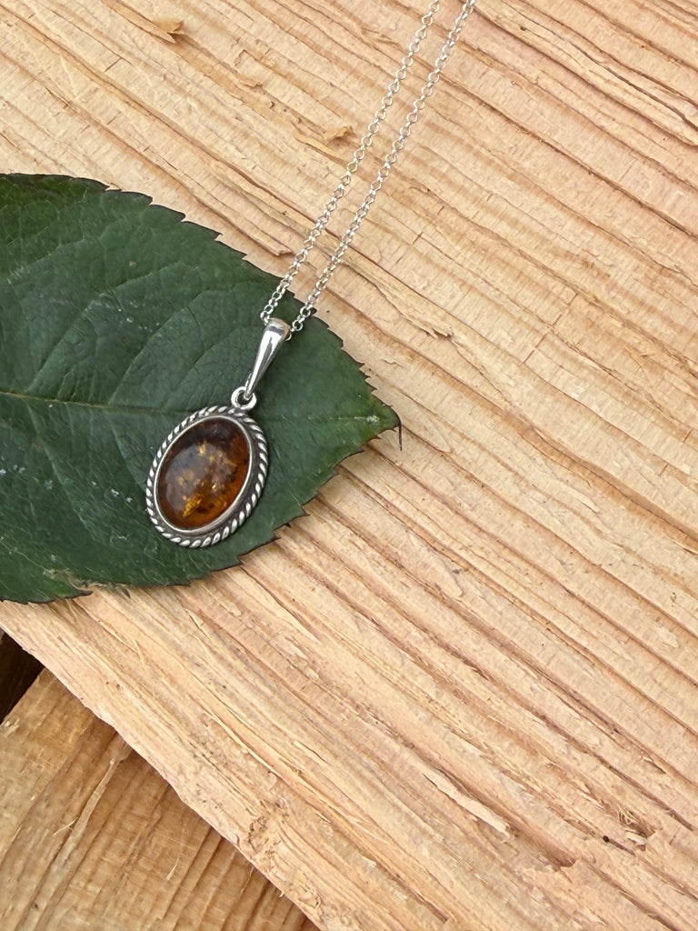 This genuine Baltic amber necklace features a rich honey-toned oval stone, naturally formed over millions of years. Set in a classic sterling silver rope bezel, this piece blends earthy elegance with vintage charm—perfect for everyday wear or layering.