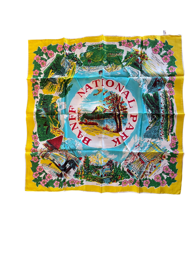 Vintage travel souvenir scarf from Banff, Alberta, Canada. This gorgeous mid century scarf highlights the best of Banff. Rayon, measures 28” square .