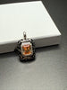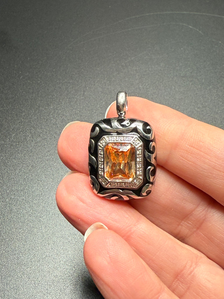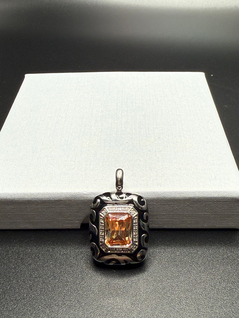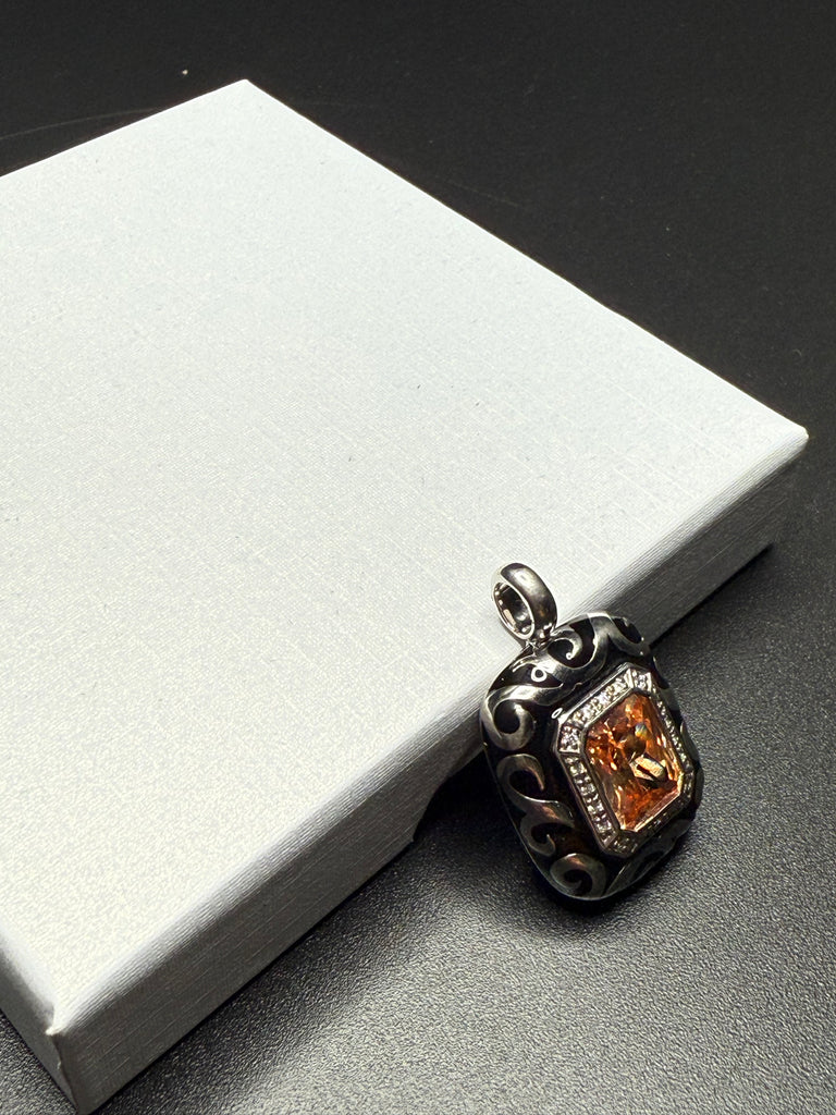 . It features a champagne-colored center stone, surrounded by a halo of white stones. The pendant's frame is crafted from rhodium-plated, nickel allergy-free 925 sterling silver with intricate scrolling designs set against a backdrop of hand-painted black Italian enamel. Measures 1x0.75”