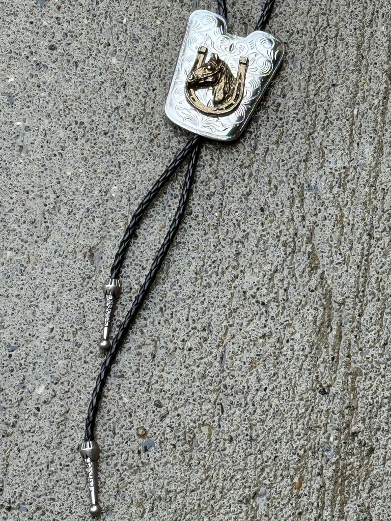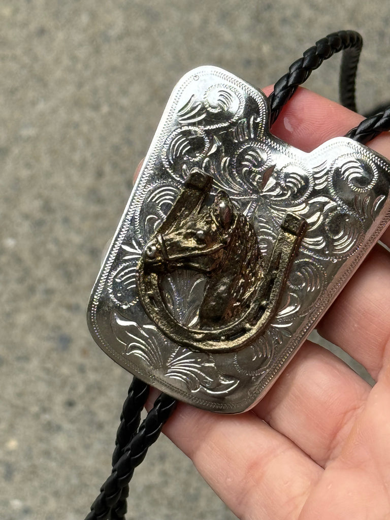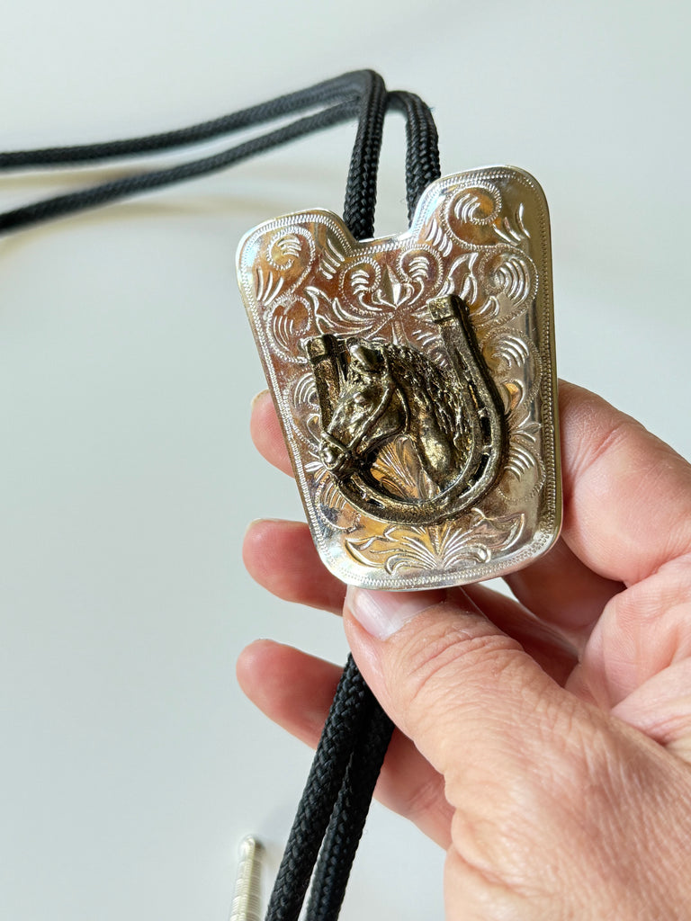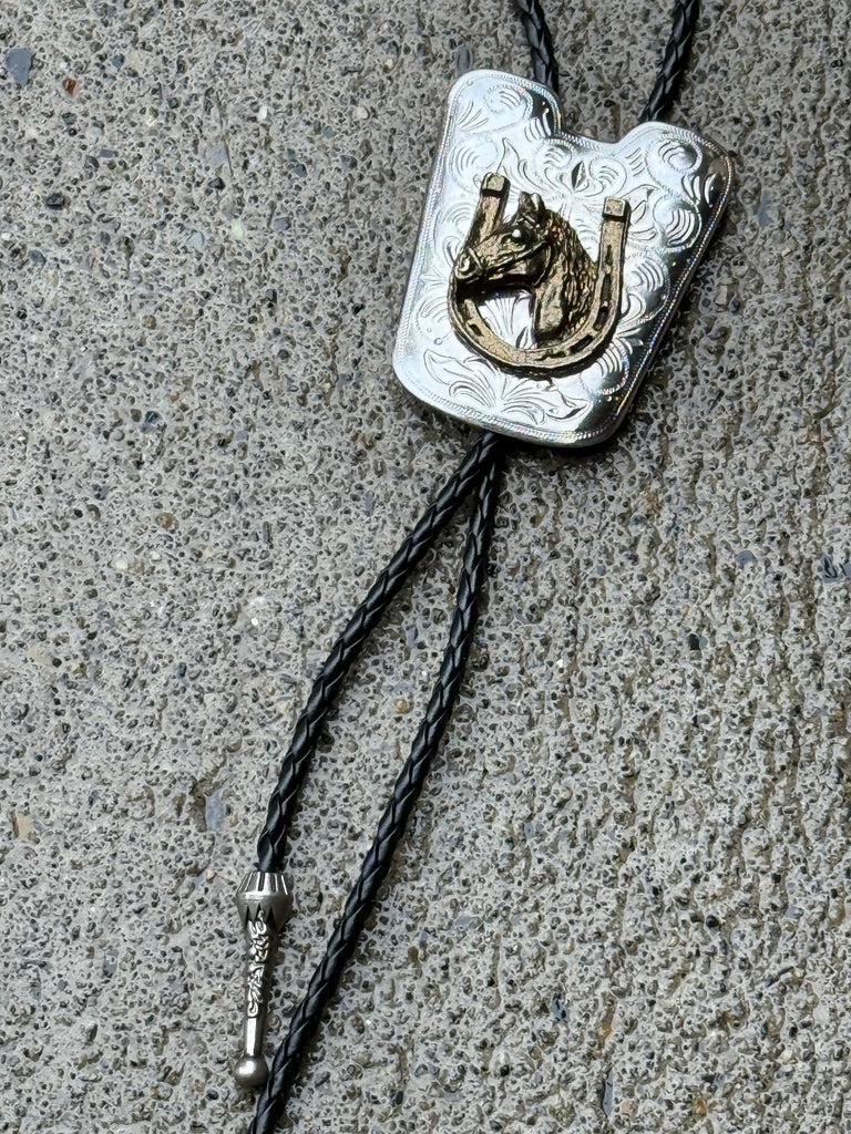 Giddy up! Vintage bolo tie with horse and lucky horseshoe design. The perfect accessory for any cowboy or cowgirl!
