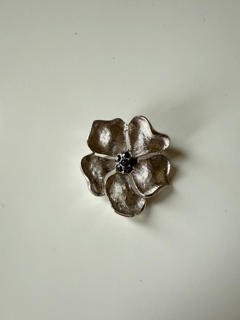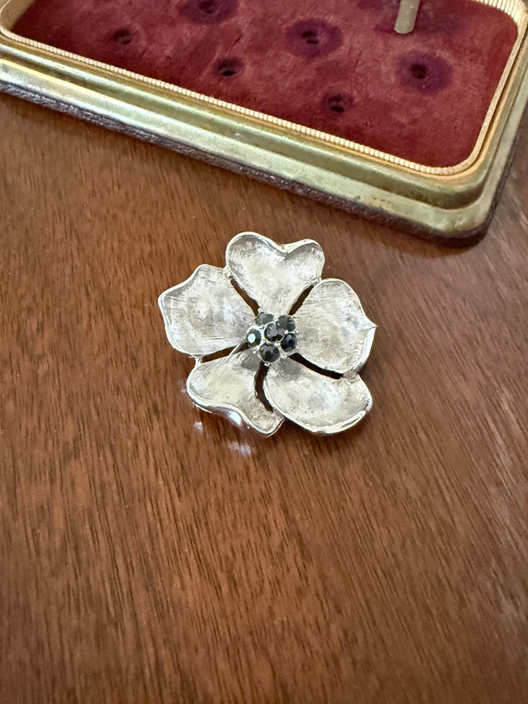 Elegant and timeless, this vintage dogwood flower brooch features softly sculpted silver tone petals with a dark rhinestone center.