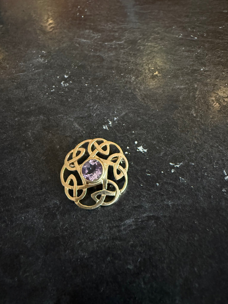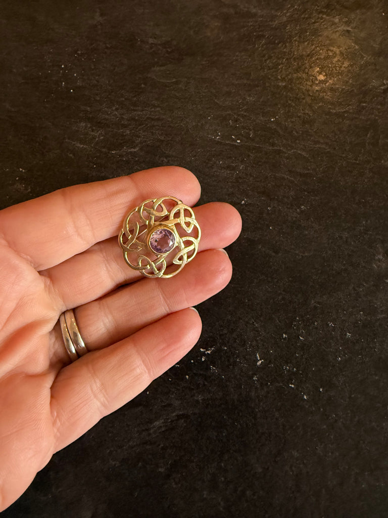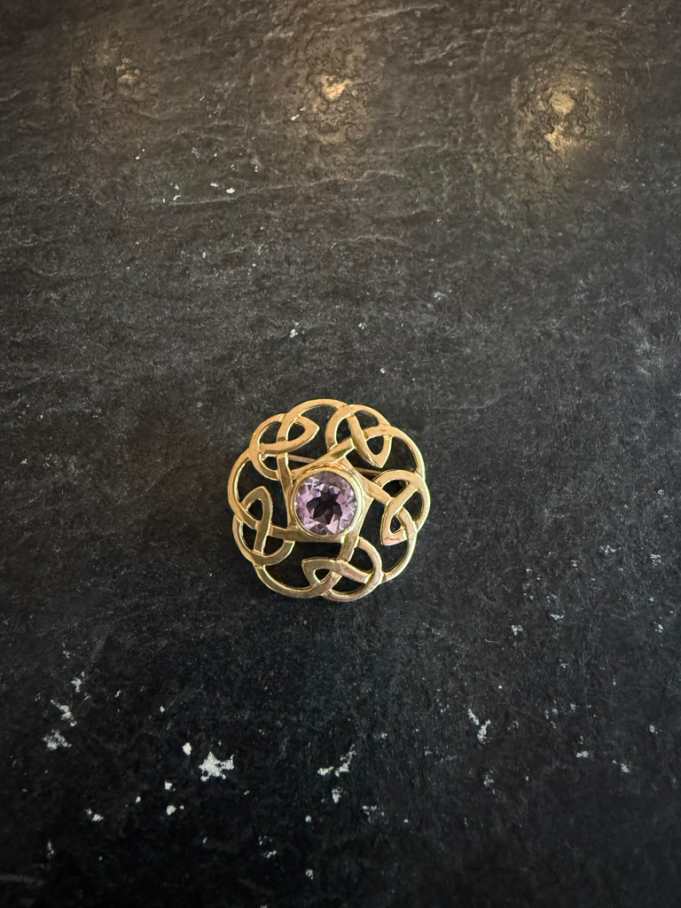 Vintage gold plated sterling silver, Celtic brooch with rich purple stone. Classic Celtic design, very well crafted, timeless.