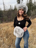 Genuine luxurious, grey fox muffin and hat, perfect for cold winter days. Natural fur. This beautiful muffin contains a hidden zippered compartment to carry your cards, and keys. This duo is the ultimate combination to keep you warm and stylish on cold winter days. Matching coat also available. Made by Benzing Furs of Calgary, Alberta