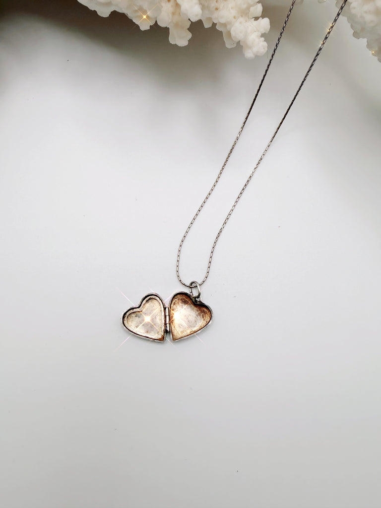 Vintage silver heart shaped locket necklace, with floral design. This classic locket is perfect for gifting, or keeping close to your heart. Chain and locket are both stamped 925.
