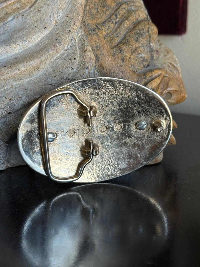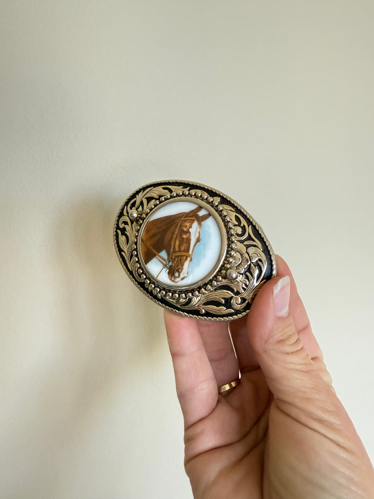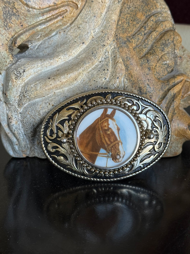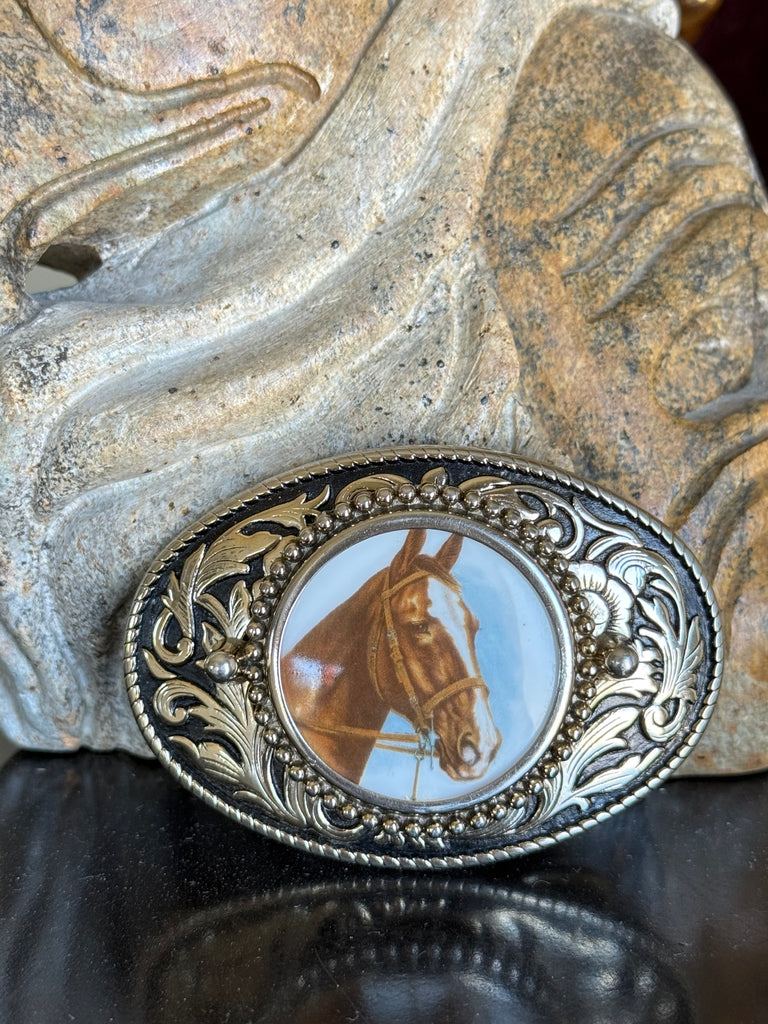 Nocona Horse Head Floral Edges Belt Buckle, made in the USA. Perfect for him or her, fits most belts.