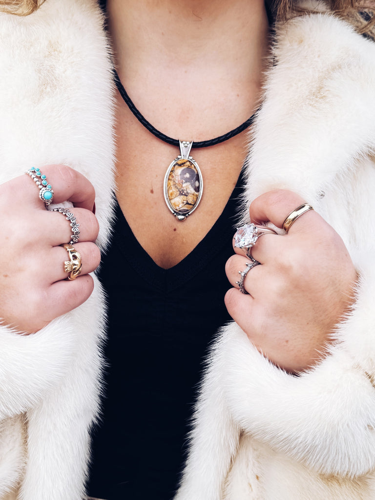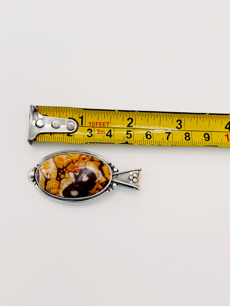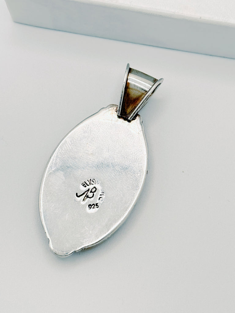 Handcrafted Navajo pendant in sterling silver with picture jasper. Picture Jasper is known for its unique colours and designs that are thought to resemble mountains and landscapes. Handcrafted by skilled artisan, this beautiful pendant is meant to be loved for a lifetime.