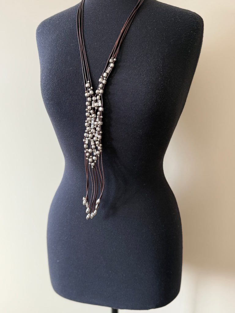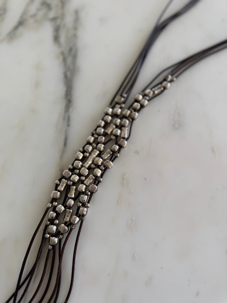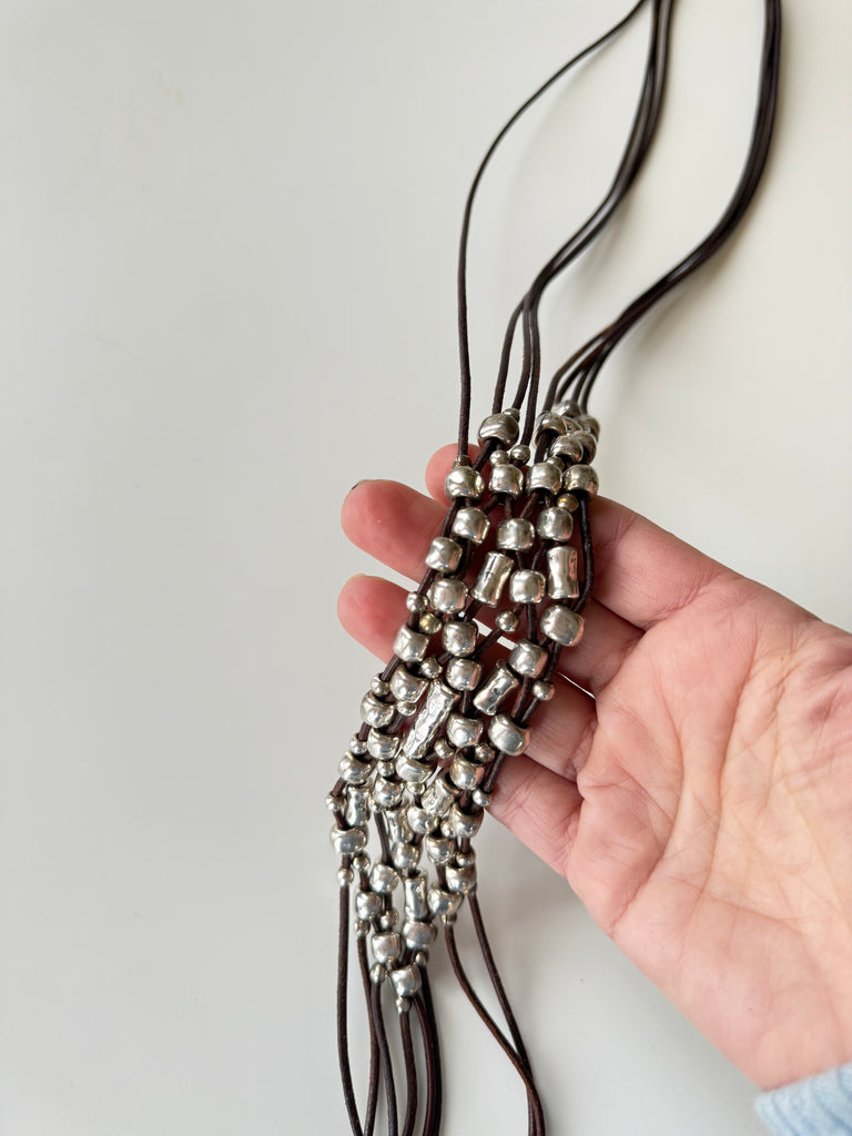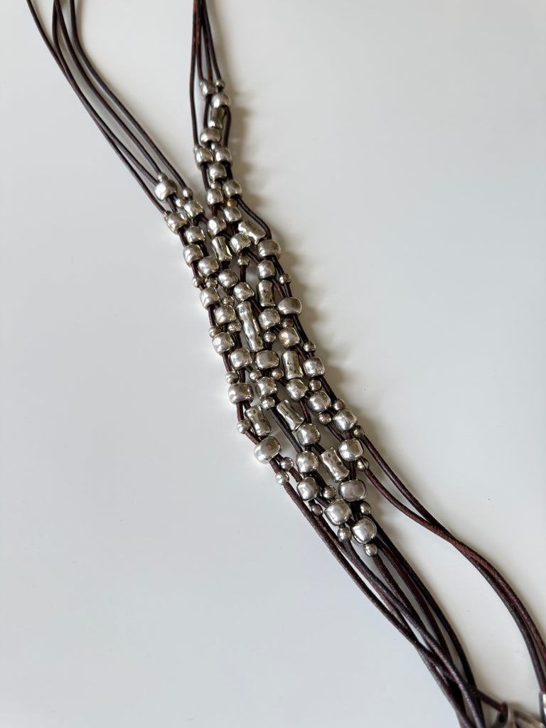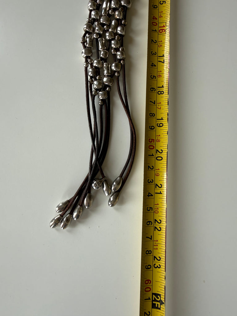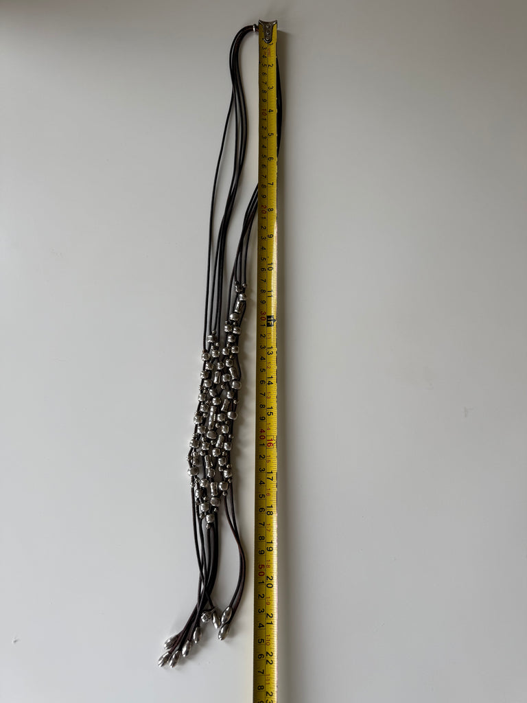 Materials: Leather cords, silver-plated metal beads