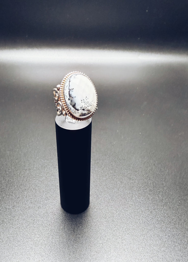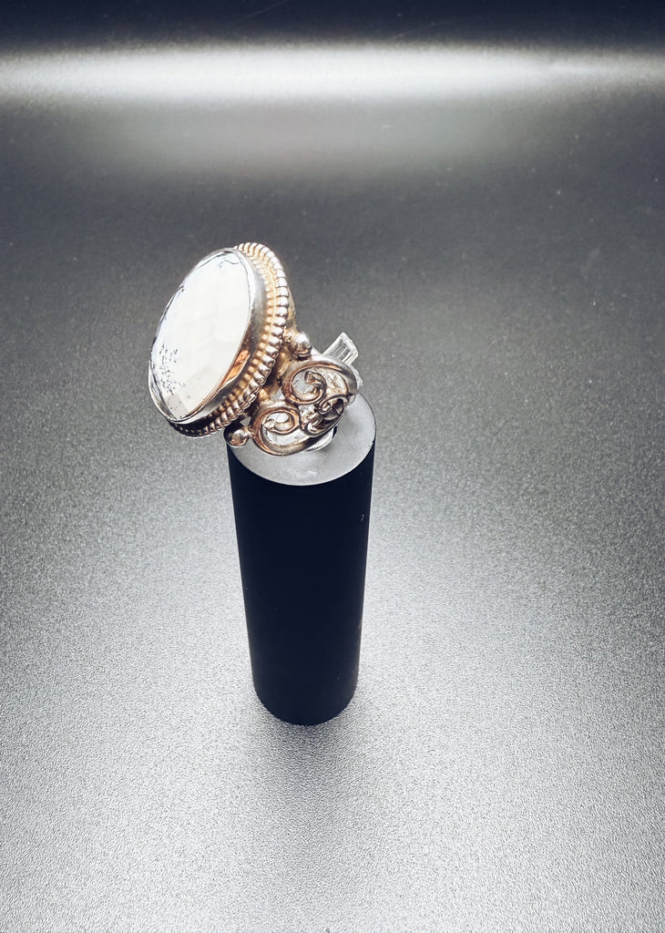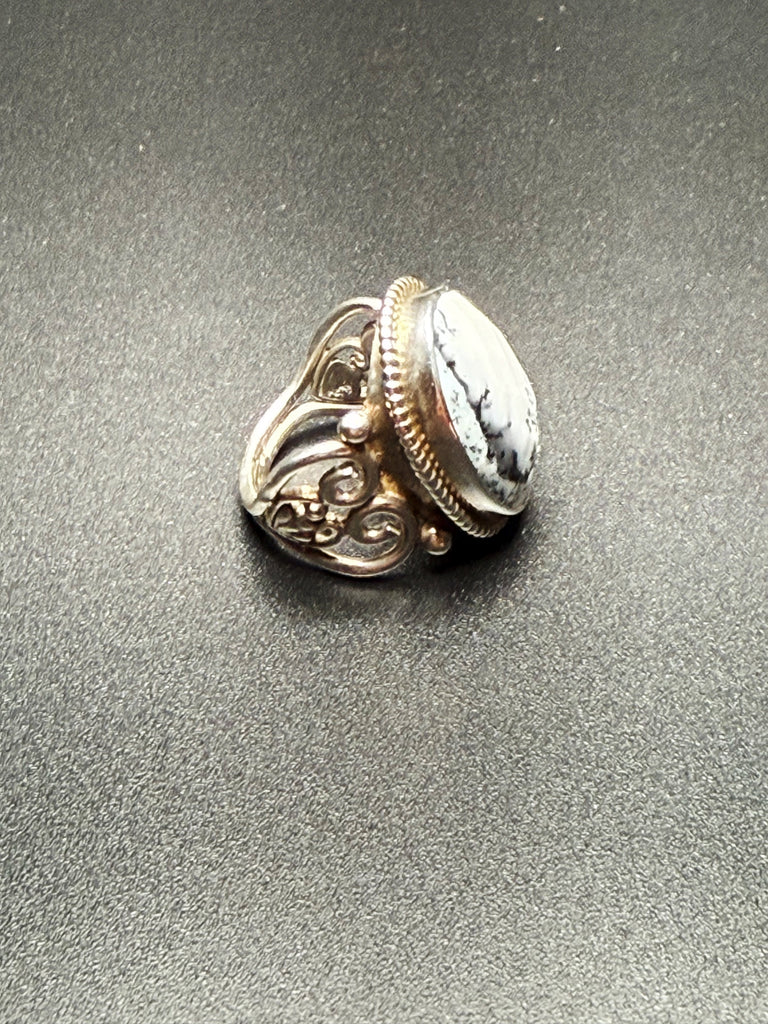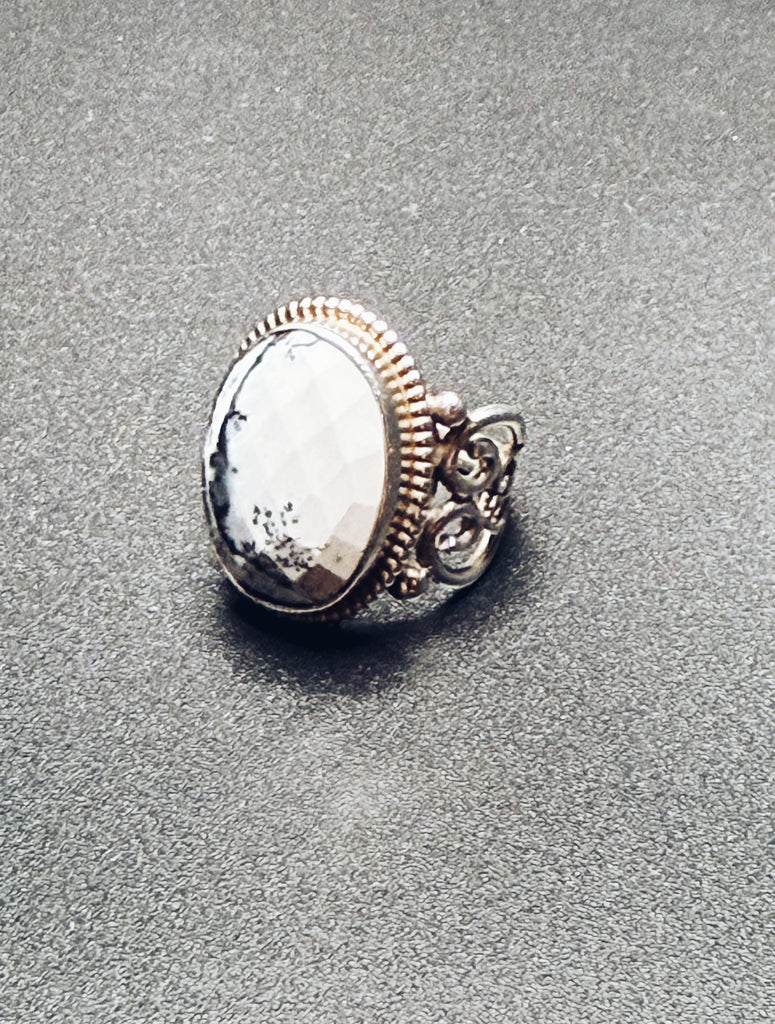 This stunning ring is the perfect mix of western charm and timeless style. Faceted stone features natural black and white pattern, making this beautifully one-of-a-kind ring a stand out. Size 7.