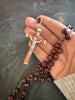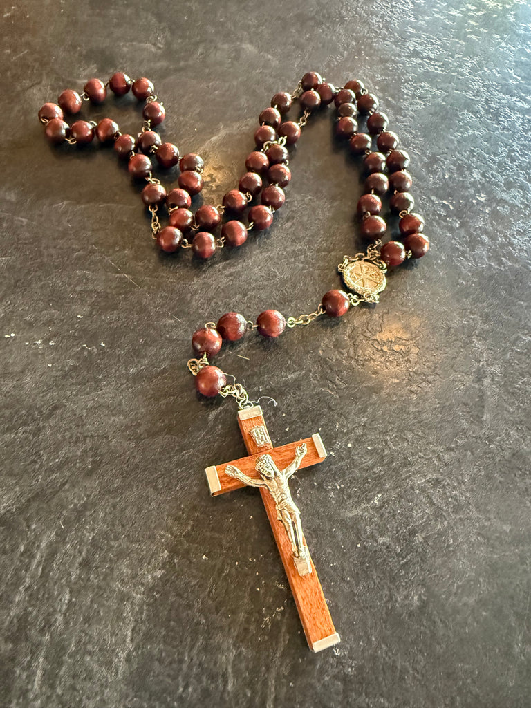 Vintage Catholic Rosary with Wooden Beads and Cross, made in Italy. Measures 22”. Cross measures 2.5”. Very masculine design.