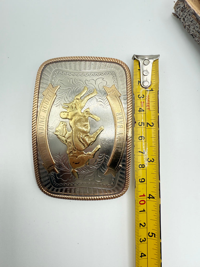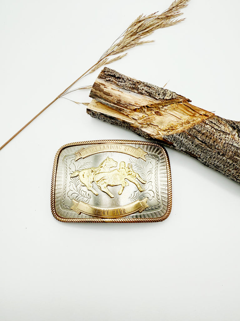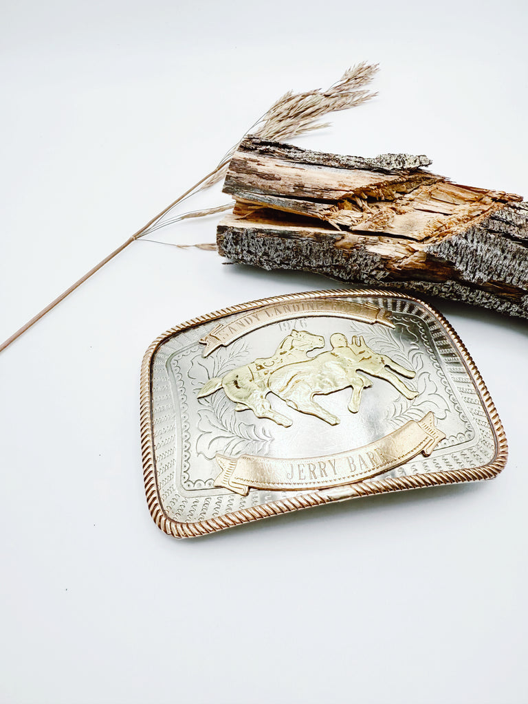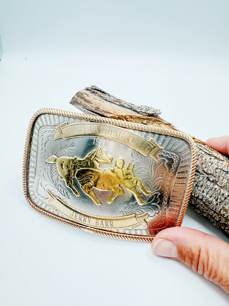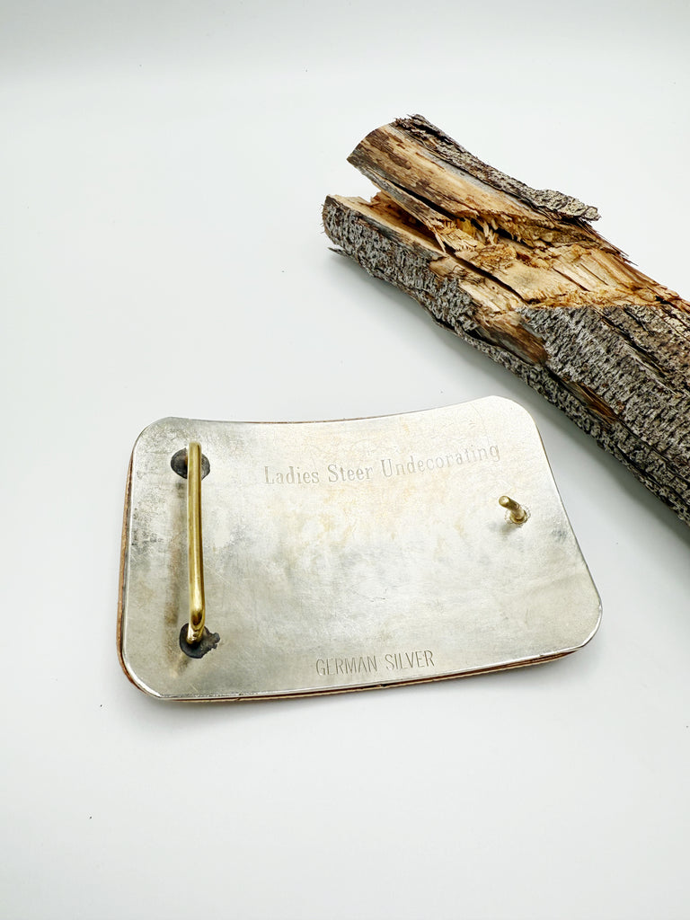 Vintage Rodeo Trophy belt buckle in German Silver, dated 1976. This 50 year old buckle was wone by a Canadian Cowgirl for steer undecorating, a fierce rodeo event for women. In this event, rather than having to slide over the side of the galloping horse and stop the steer, the cowgirl has to catch up to the steer and remove the ribbon attached to its back.